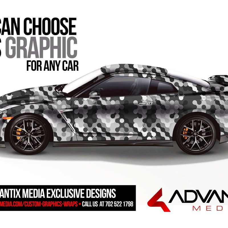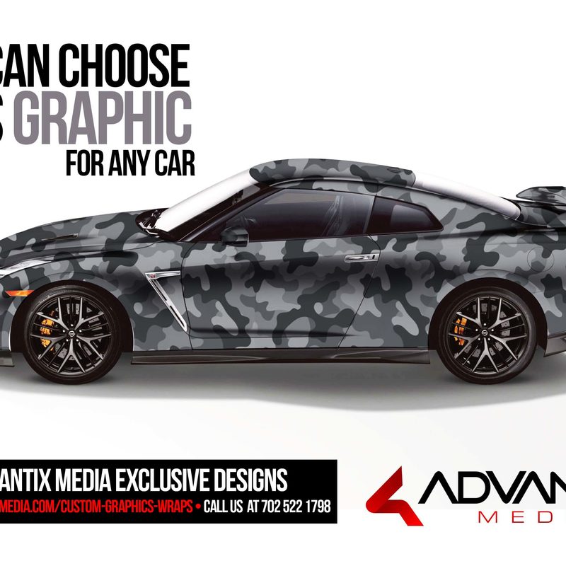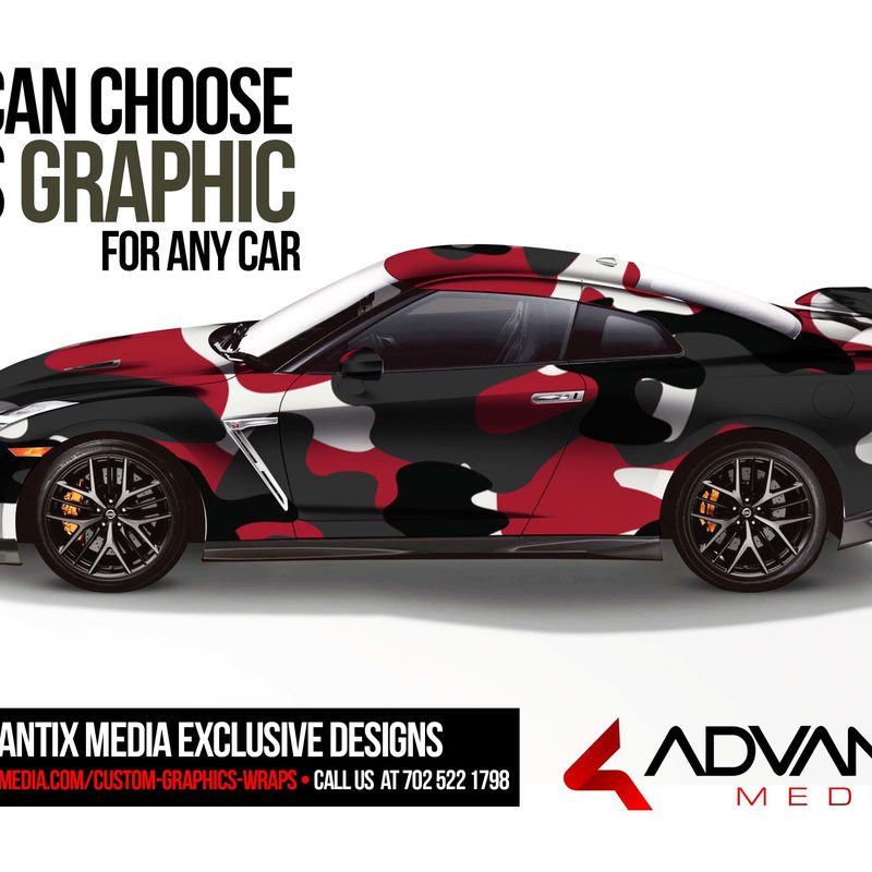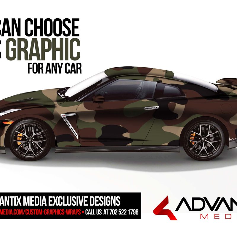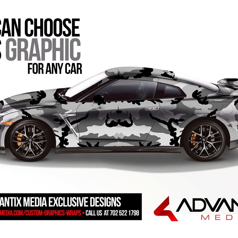 We have a wide range of designs to choose from including several types of camos and stylish backgrounds. What's cool is that any of of these designs can be customized for any type of vehicle or car including Hummers, Porsches, Lambos, Jeeps, GT-Rs, Camaros, HellCats, BMWs, Mercedes as well as any type exotic car.